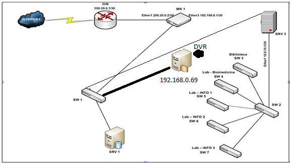 Só para visualizar melhor a situação peguei uma imagem qualquer e alterei como se encontra a rede aqui,veja  que o link entra pelo GW neste caso é uma RB 450G e paralelo uma a RB750GL conecta em um switch e o DVR conectado no switch também.