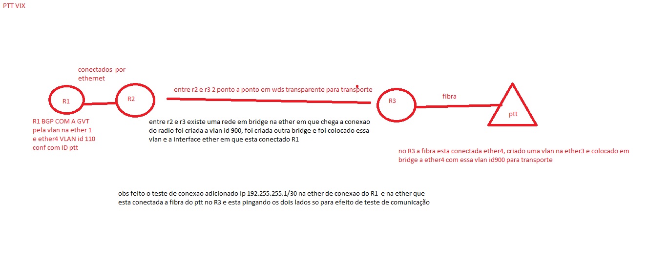 boa noite amigos, por favor poderiam me dizer se e possivel o ptt aceita e levantar as rotas com esse cenario pois parece que tem uma questao de informar o mac da interface conectada porem sao varias interfaces e nao sei qual posso informar, o cenario esta mais/menos desenhado tive que fazer 2 ponto a ponto ate o ptt e de la levar o resto a fibra porem nesses 2 ponto a ponto servem tambem passam outras redes em vlans /30 para atender meus clientes.