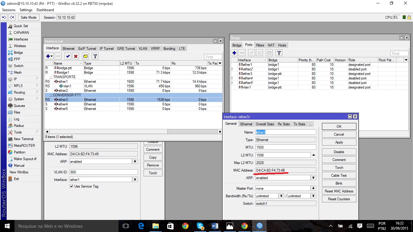 R3 PTT ether 4 fibra ptt ether3 conexao do radio, criado vlan id900 para transporte na ether3 e feito bridge entre essa vlan e a ether conectada ao ptt