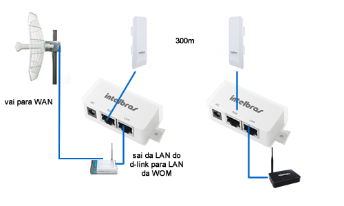 um cabo vindo da porta LAN do D-link para a porta LAN do WOM 5000
