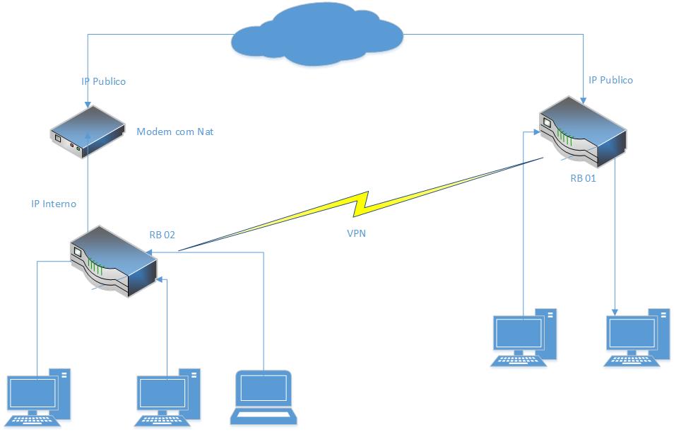 tenho atualmente uma RB 750 como VPN server, facilmente consigo conectar usando usuário e senha direto via vpn, seja no meu celular ou computador, o que preciso agora é conectar outro mikrotik e colocar todos os pcs na mesma rede conforme figura abaixo