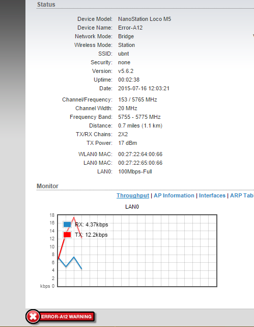 O cara da UBNT aqui diz que erro A12 é falha na memória flash: