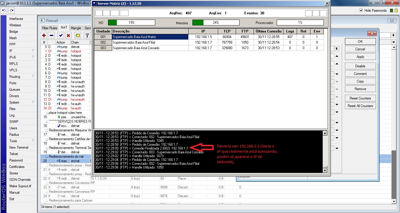 Na minha loja matriz, possuo um servidor ftp que as outras duas lojas se conectam, porém estas duas quando verifico no servidor ftp ele aparece elas conectadas mostrando o ip do mikrotik da matriz e não aparece qual maquina das filiais que se conectaram...