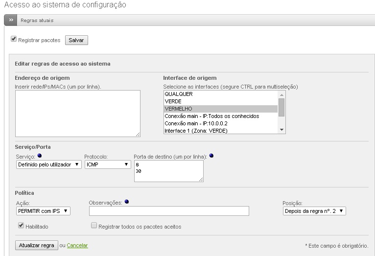 Na opção Acesso ao Sistema, cria-se essa regra. Fazendo com que o IP do Endian também responda ao ping.