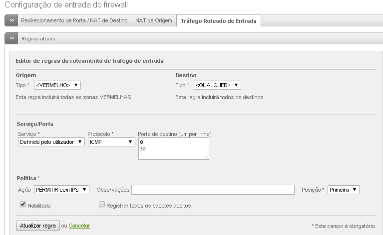 E em Redirecionamento de Porta / Nat > Tráfego Roteado de Entrada. Cria-se essa regra, fazendo com que a rede interna responda ao ping.