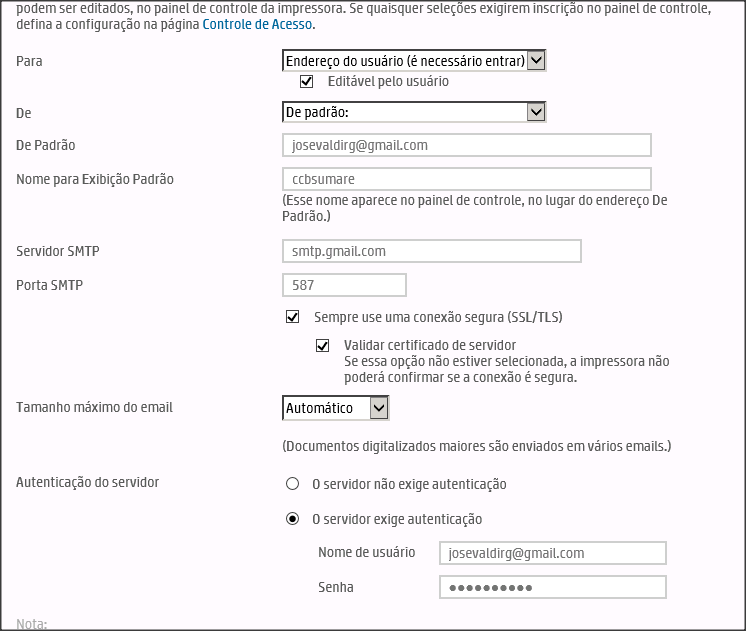 (Tenho um DVR que tem opção de mandar avisos via email e não tem config. de SSL, é só server, usuario e senha, mais nada, se eu fosse usar isso teria que achar email que não exija SSL, talvez seja o caso dessa impressora, sem opção SSL ou TLS, não ponho a mão no fogo por HP)