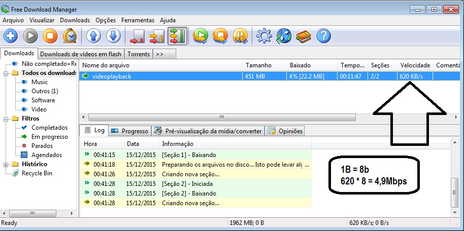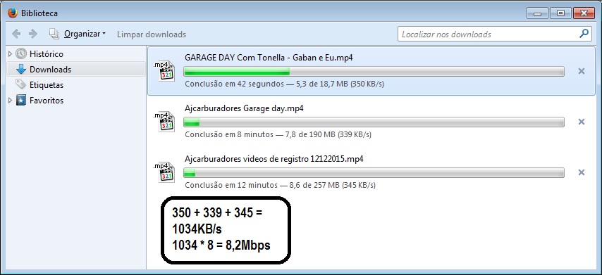 Minha ADSL é residencial de 10Mbps, comecei a fazer um download de um vídeo no Youtube, ele abriu só 2 instâncias por isso não deu muita velocidade, mas deu 620KB/s: