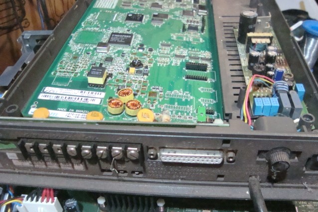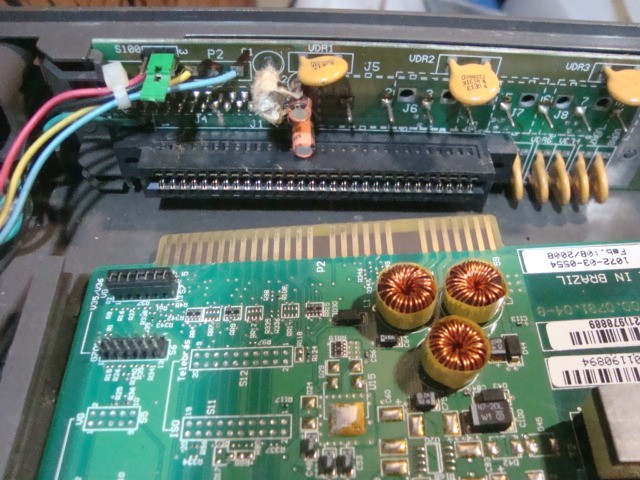 É uma placa específica pra isso, muuuuuito boa, processador de primeiro, tudo de bom. Mas dá pra ver nessa foto de cima que tem um capacitor estourado, aí não adianta a placa ser boa.
