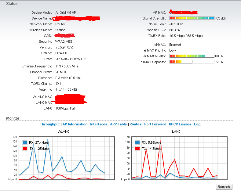 E se nada disso mudar o comportamento, hora de ver com o provedor, vai que ele está com a setorial lotada de clientes, ou tem um pigtail molhado, ou vai que ele detecta que o seu sinal chegá lá baixo tipo -80dBm, isso indicaria que o amplificador do seu Airgrid queimou (Mistura usar alta potência (26dBm é GRITAR) com a provável falta de aterramento), e amplificador queimado não muda o sinal que você escaneia, você recebe -63dBm da torre, e a torre devia receber o mesmo de você, mas se seu sinal chegar lá baixo o problema é no amplificador.