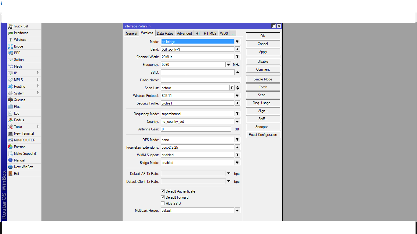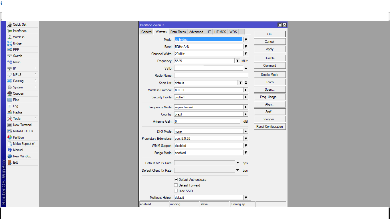 Vou postar aqui a aba wireless do Mikrotik pra ver se alguem descobre, acho que o problema esta no MK