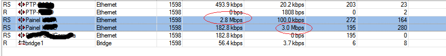O comportamento ao ativar qualquer uma das regras é perca de comunicação do painel A, os clientes perdem navegação e uma coisa que observei, parece que as interfaces dos paineis A e B estão dependendo uma da outra. Veja onde tá circulado em vemelho, mesmo com tráfegos muito diferentes entre os paineis, mesmo sem tráfego algum em um deles, os valores oscilam de forma similar, qualquer coisa q eu fizer com uma dessas interfaces, não me lembro bem qual, a outra perde acesso! São portas fisicamente diferentes, uma não tem nada haver com a outra, só estão na mesma bridge, porque isso??? Parece uma especie de "loop" nas interfaces...