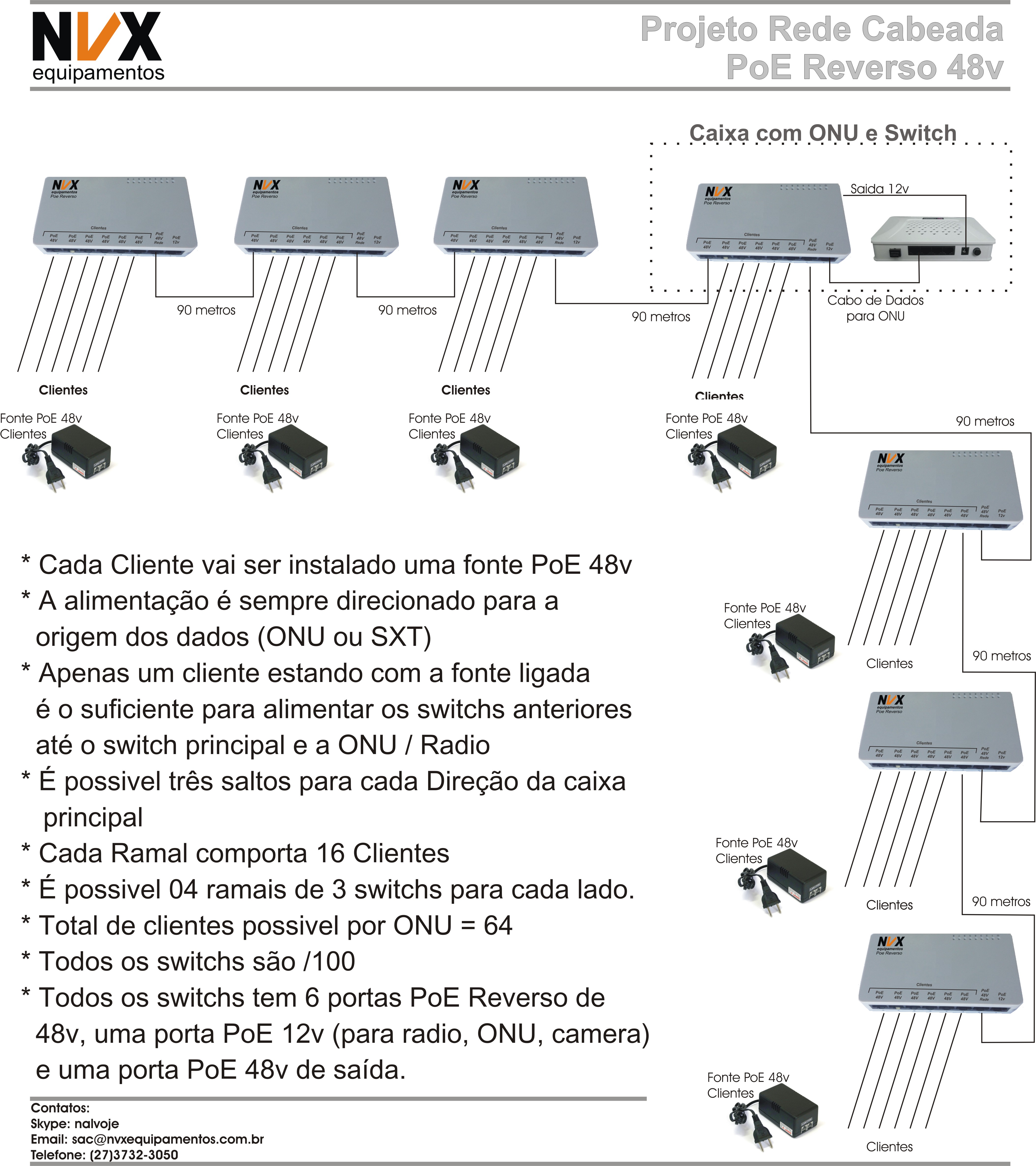 Usando fonte 48V nos clientes a queda de tensão é menor, e switch que aceita 48V geralmente é com um VRM de range tipo 10 a 48V, ou seja, ainda que tenha 3 ou 4 switch em série sem nenhum cliente deles ligados, o switch anterior (E seus clientes) darão conta disso, vai ter 30 ou 35V depois de alguns switch sem clientes mas esses switch aguentam.