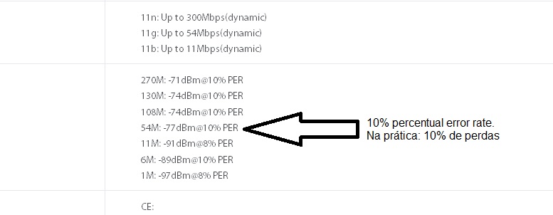 Que alias é taxa de erros na sensibilidade nalguns datasheets, aqui de um TP-Link (Só posto esse porque a UBNT e MK não dizem a taxa de erros, mas se padroniza a informação com 10%):