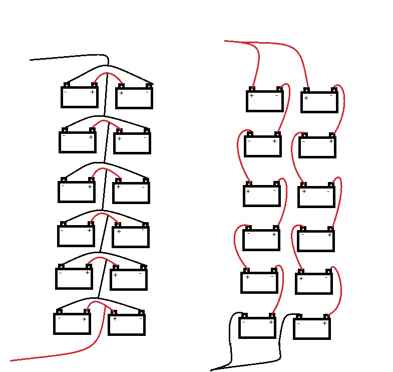 Ter só 2 baterias em paralelo como tem hoje não é um problemão, mas a grosso modo o modelo da direita no desenho tosco acima é mais recomendado porque se 1 ou 2 células ruins de uma das baterias criarem problema elas consumirão a tensão de todas as baterias do conjunto ao lado, e não só de 1 bateria (Como na opção da esquerda).