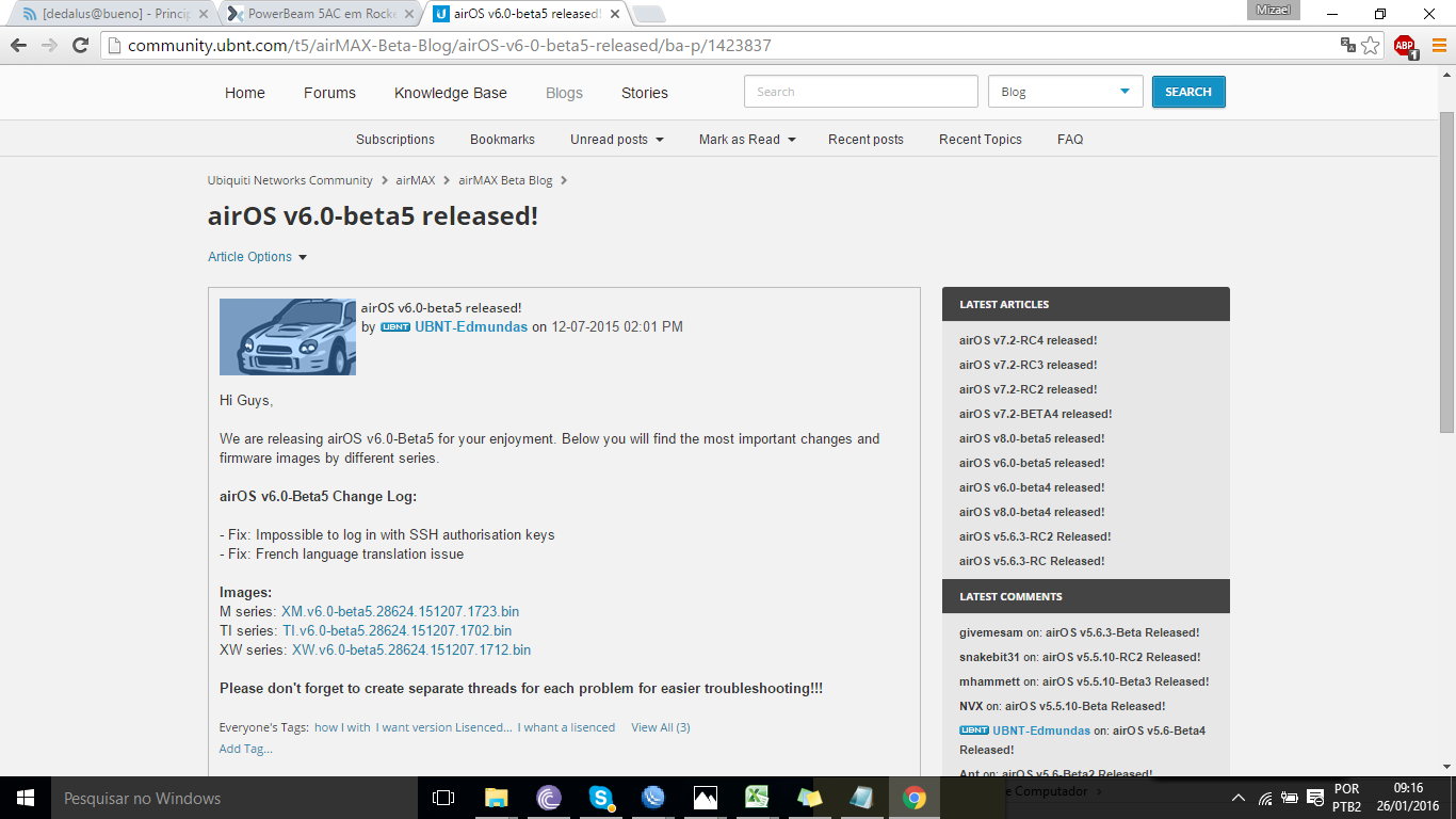 O Rocket atualizei com o fw XM.v6.0-beta5.28624.151207.1723.bin e o PowerBeam atualizei com o fw WA.v8.0-beta5.29710.151207.1653.bin.