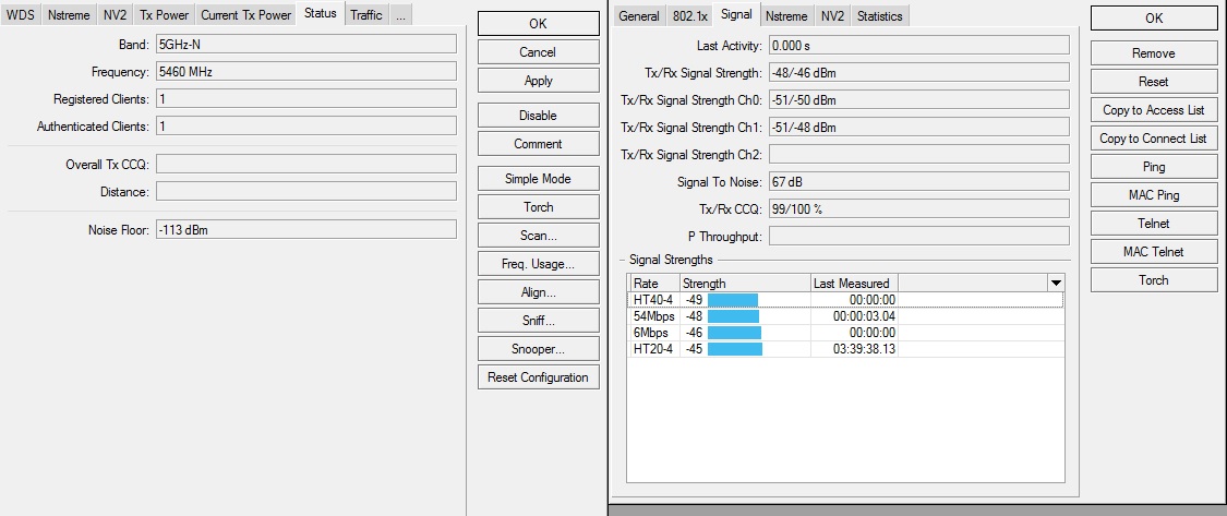 (E no datarate de 6M aparece sinal a -46 a -48dBm porque ele é emitido em potência maior mesmo, também é normal, por isso digo que é importante ver o sinal real do datarate usado, no caso HT40-4 no chain0 e chain1)
