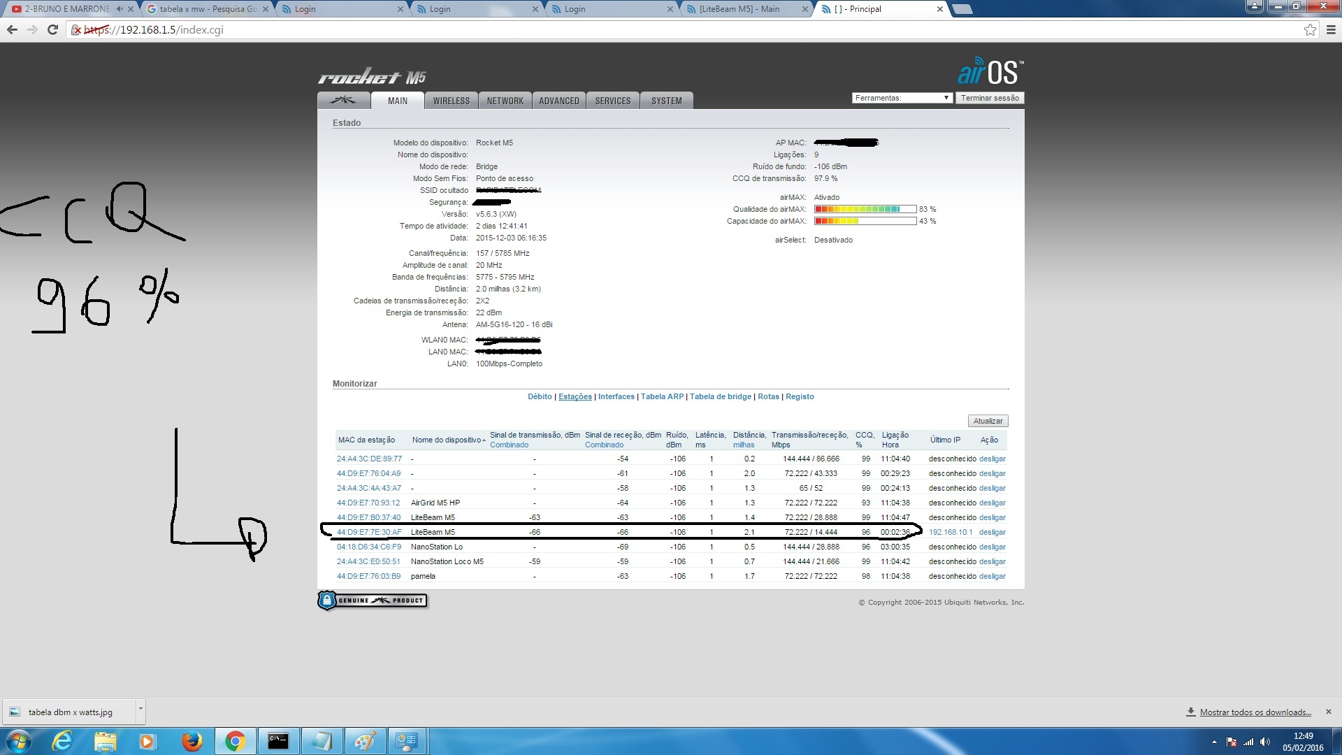Rocket M5 não é um hardware estupendo, é pobre demais comparado a uns roteadores de mesa (Digamos um TP-Link Archer C7), digo, é um hardware pobre pra 2015. O chipset de RF é quem lida com esse monte de sinal baixo DOS OUTROS, ou é ele quem sofre com ruído (Noise floor alto), e o chipset de RF nos Rocket é separado da CPU, é um chipset AR9280 muito comum em vários roteadores de mesa (A CPU é um AR7240, comum até em roteador Intelbras de R$ 120), por isso é complicado ter CCQ de 100% quando UM MÍSERO cliente tem sinal ruim.