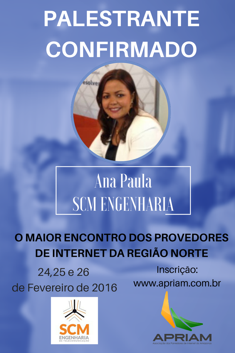 A Engenheira Ana Paula Lira Meira é Diretora Geral e Sócia da Empresa SCM Engenharia Ltda. que há 8 anos presta serviços a cerca de 2000 empresas provedoras de Internet em todo o Brasil.