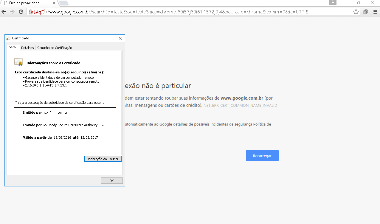 A msg de erro é a mesma que da quando uso o certificado assinado pela Go Daddy