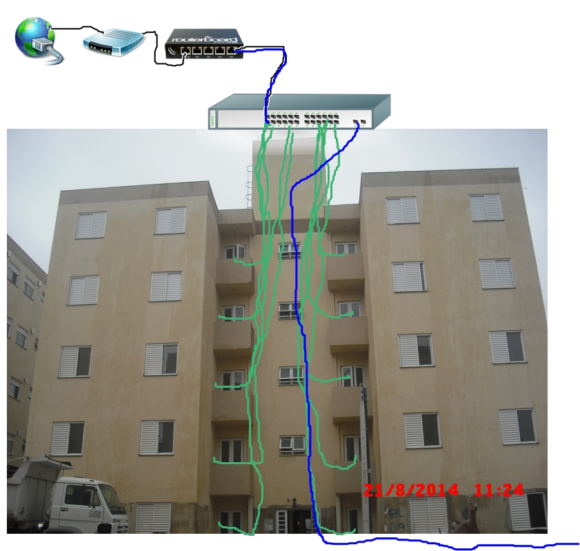 eu pensei em fazer o seguinte . 1 antena setorial 90° no meu bloco para enviar o sinal ,1 mikrotik rb951, para os outros 14 blocos , colocaria nano loco , para receber o sinal da setorial . Colocaria em cada bloco, 1 switch de 20 portas para descer internet por cabo para cada apartamento, ,,,,,, todo material em 5,8 por favor me ajudem e que Deus abençoe á quem pode e á quem não pode ajudar,,,, segue as fotos , uma de baixo e outra do alto dos prédios,