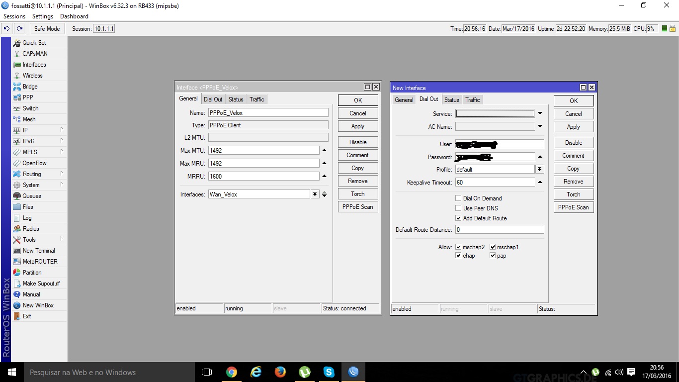 Galera, seguinte, tenho um link adsl da OI de 15MB e uso um modem da propia oi da technicolor em bridge e faço autenticação por uma RB433uah e de umas duas semanas pra cá, o pppoe desconecta e nao consegue mais conectar, pra conectar novamene é dar rebbot na RB ou desativar porta q esta ligada o modem e o pppoe dai ativar novamente, dai ele consegue conetar novamente.
