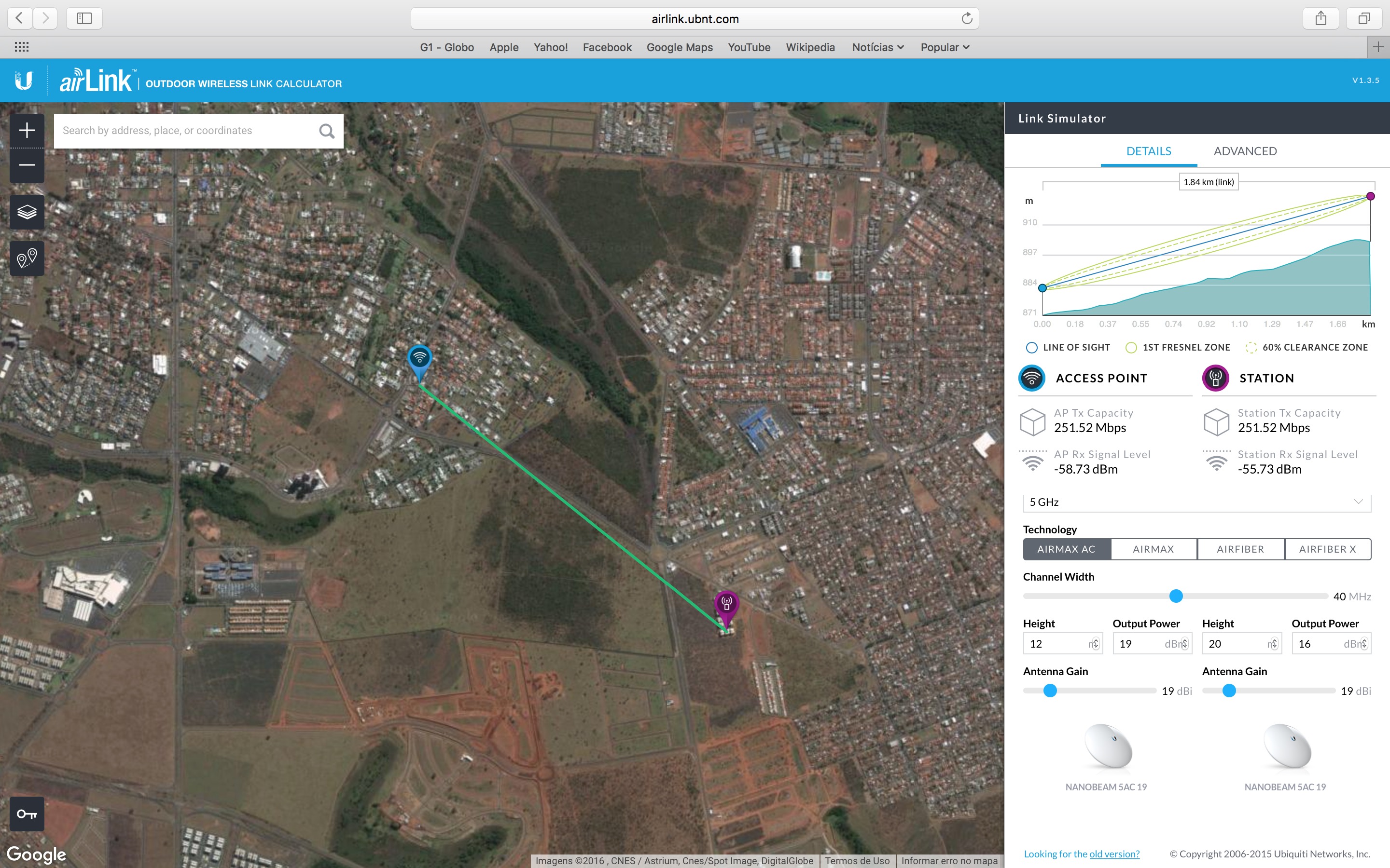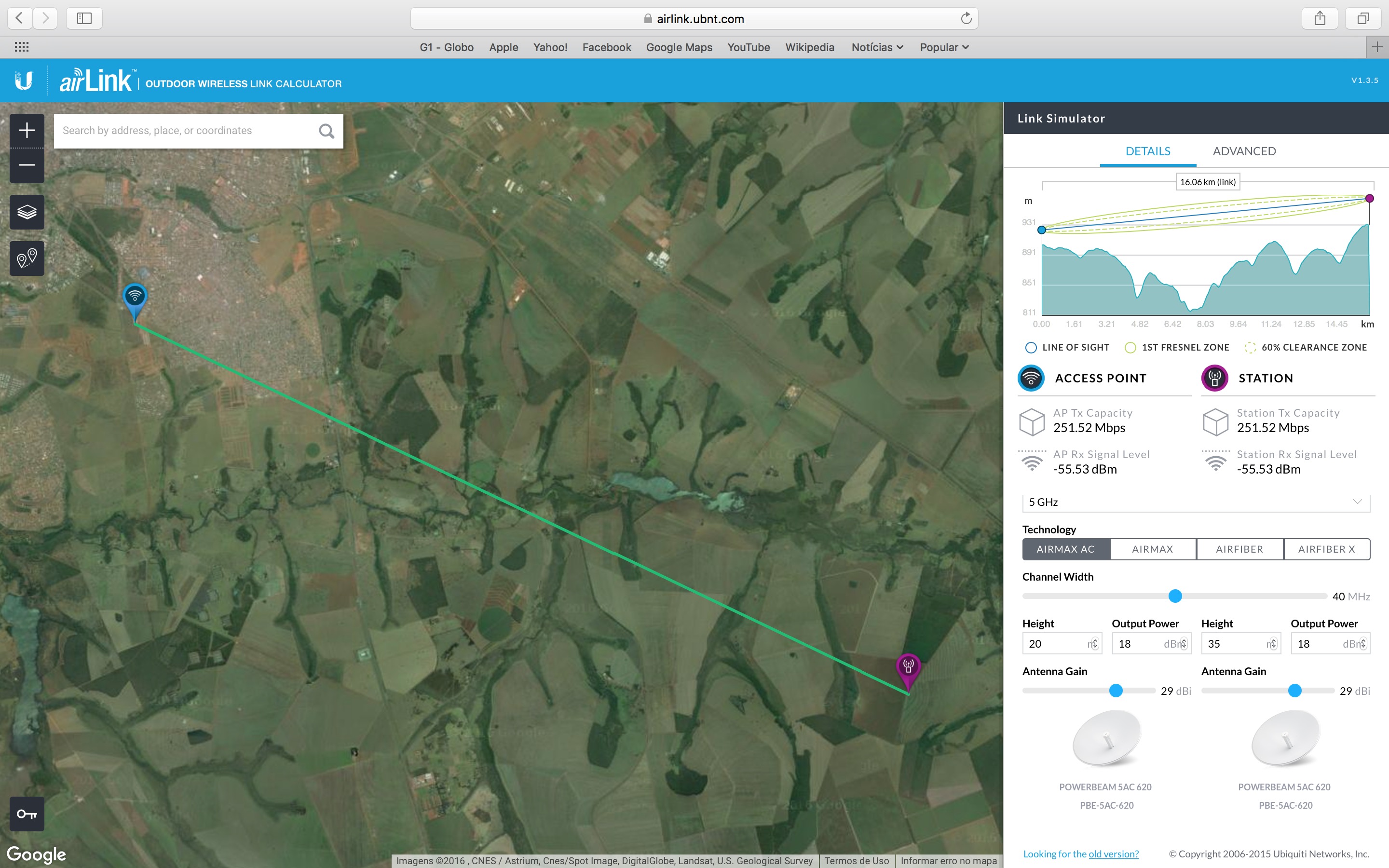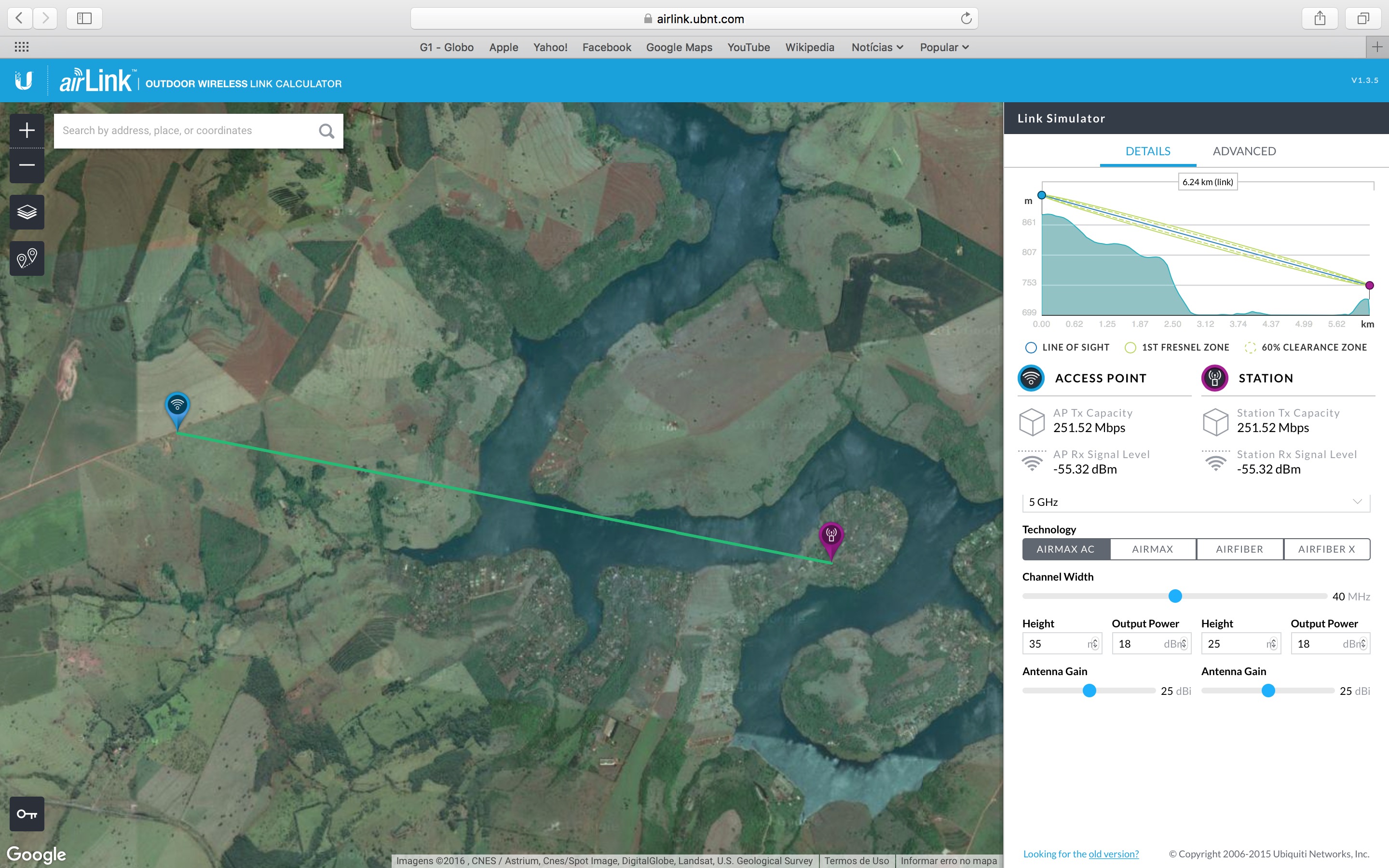 Pensei em subir uma torre em um lote na cidade mais próxima (Indianópolis, MG) e enviar o sinal de uma ADSL 10Mbps até o rancho via rádio. Dei uma olhada no airlink.ubnt.com e a distância é de 3.99km com visada usando torres de 15m em ambos os locais, sei que é muito mas planejo usar PowerBeam M5 300 ISO em ambos os pontos, faça chuva ou faça sol, eu quero 10mbps chegando no rancho.
