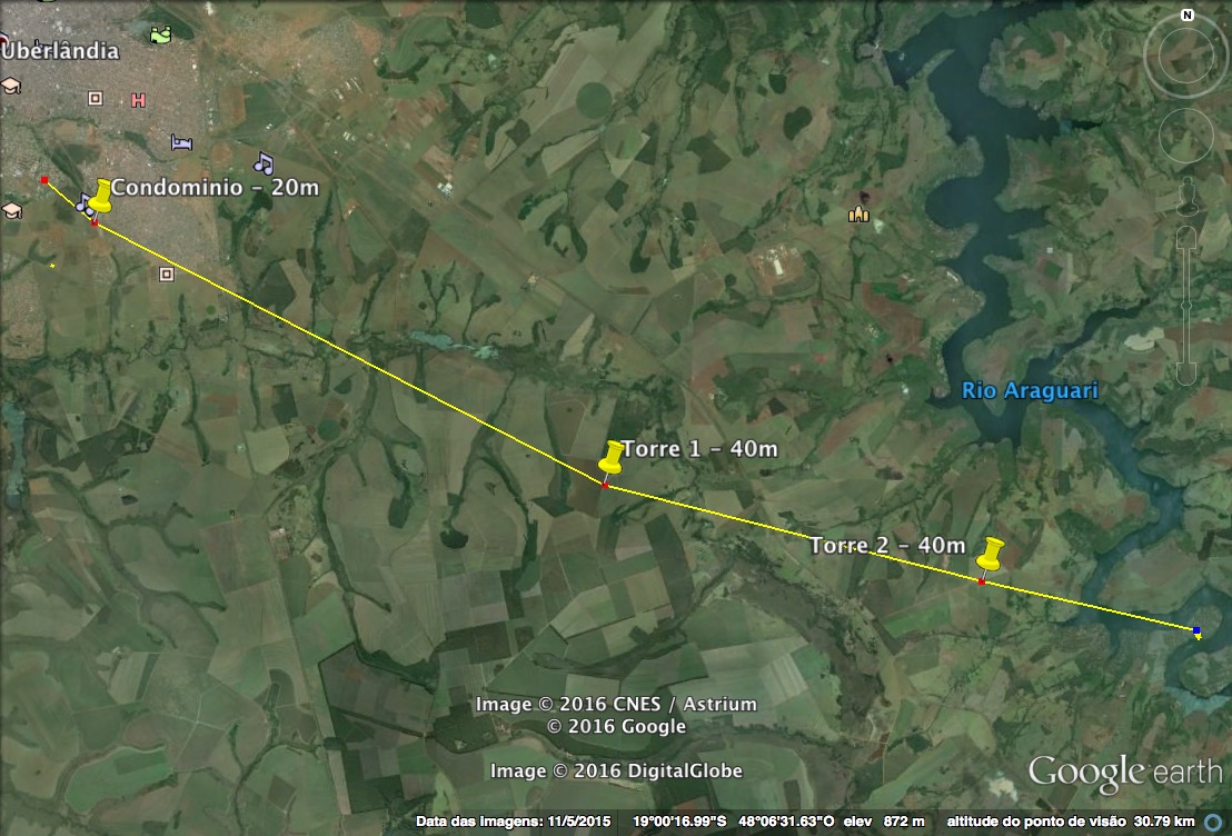 Perto de uma cidade desse tamanho não tem nenhum provedor via rádio? Porque você vai ter o custo de eletricidade nesses pontos intermediários (Ou investir pesado em energia solar), as eventuais queimas com raios (Dá pra fazer aterramento e colocar protetor de surto em tudo, mais custo), fora esse risco de ter throughput mais baixo que precisa, não adianta ter equipto AC se ficar nesses sinais de -55dBm, é um sinal meia-boca pra AC, ele serviria bem pra modo N, em MCS14 na largura de 20MHz passando uns 60-70Mbps. Pra mim que AC só faz diferença (Maior throughput que N) com sinais acima da casa dos -50dBm. E ainda que calcule de novo com equipto maior pra ter -50dBm, isso é calculo com cenário perfeito, o calculo no site não sabe ver vegetação e construções, se tiver umas árvores ou construções na zona de Fresnel o sinal só cairá, em apenas 1 PTP já tem "risco" disso, e nesse caso são 4 PTP's, o entre torres de 40m tá tranquilo, o do condomínio de 20m eu ainda fico na dúvida porque talvez não te liberar um espaço adequado e você se obrigue a colocar antena perto do telhado, comendo zona de Fresnel e tendo reflexo de telhado abaixo ou do lado logo na saída. Fora que árvore de 20m não é incomum, tem umas que a gente só vê na hora que está colocando a antena.