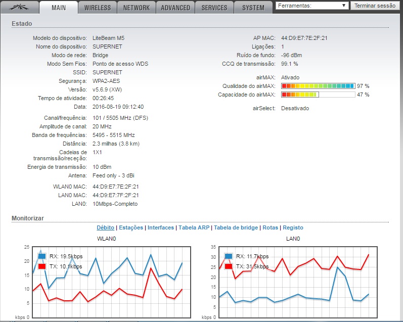 Outra coisa... Percebi que a frequencia/canal do AP está em auto... Sugiro que seja feito um "site survey" nas duas antenas e o canal /frequencia seja travado em um canao nao utilizado. Bem como a potência, que está no máximo o que não é correto pra pequena distância...