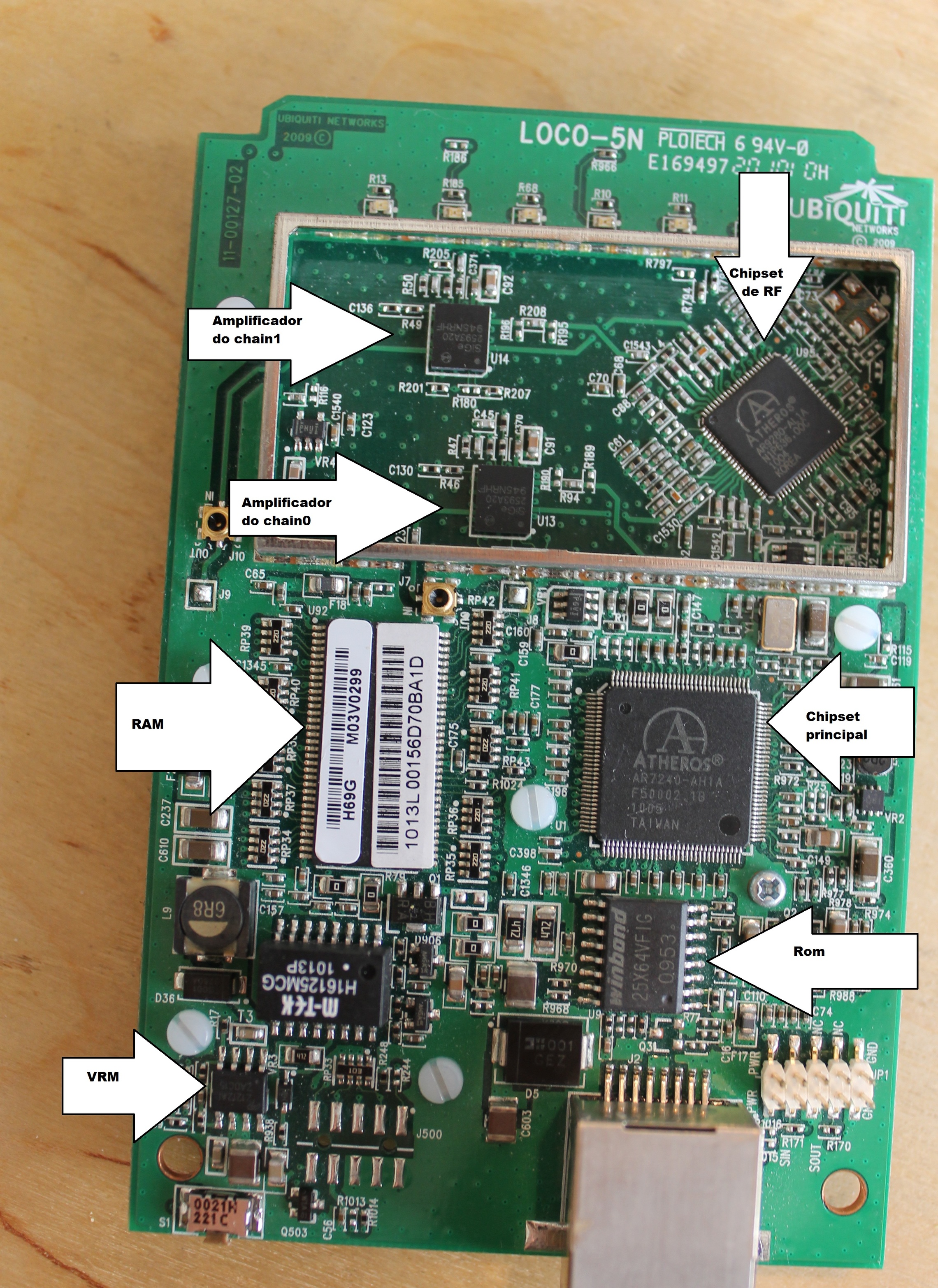 - Depois dele vem o chipset principal, com CPU e tudo, digamos um AR7240. Nesse chipset vai ligado a RAM que raramente queima, a ROM que raramente queima. Em caso de raio, se tiver chipset de ethernet na frente ele raramente queima.