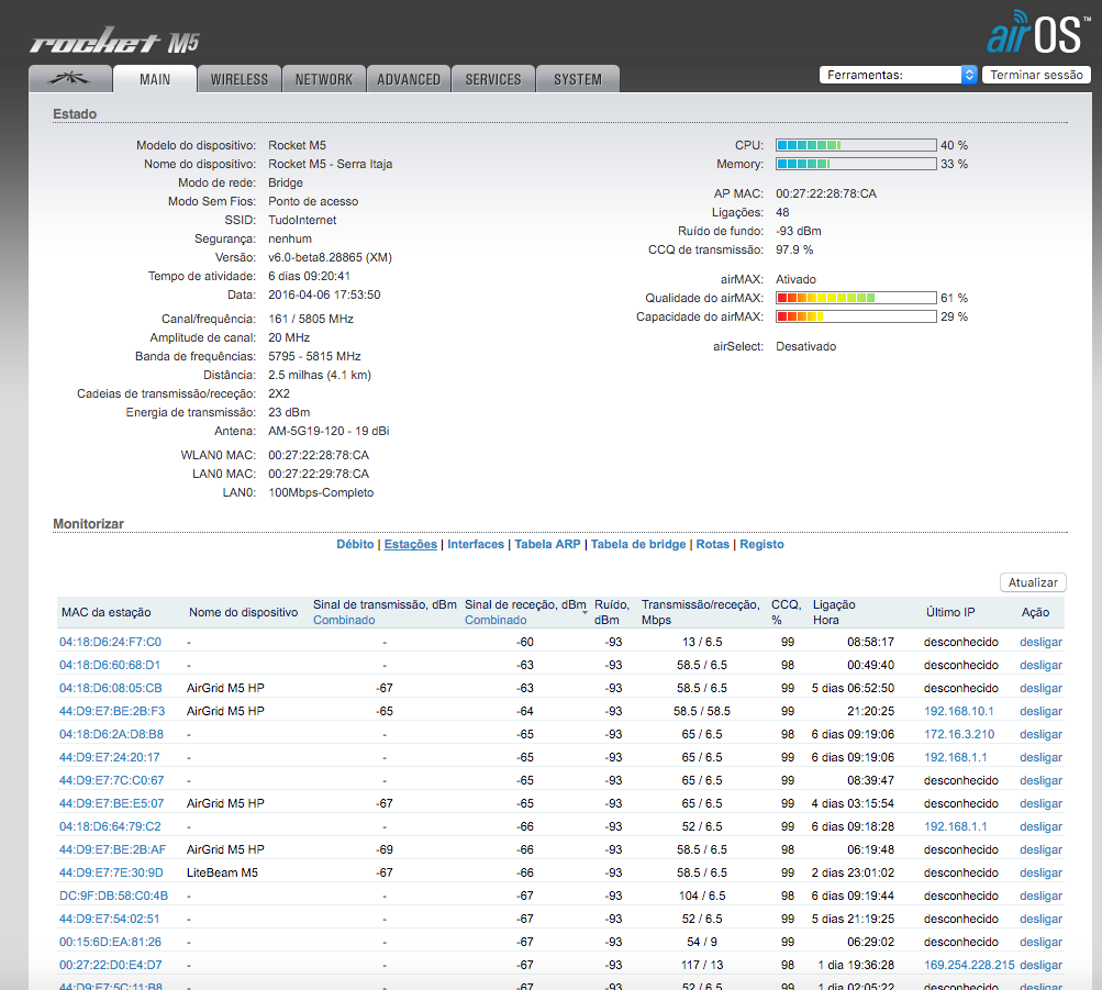 Seu Airmax capacity ta muito baixo, 29%. O ideal é acima e 80%. O meu fica acima de 80% o tempo todo. Isso indica duas coisas, uso de clientes 1x1, que nao permite mais que 50% no Airmax Capacity, mas tambem o RX e TX oscilando muito.