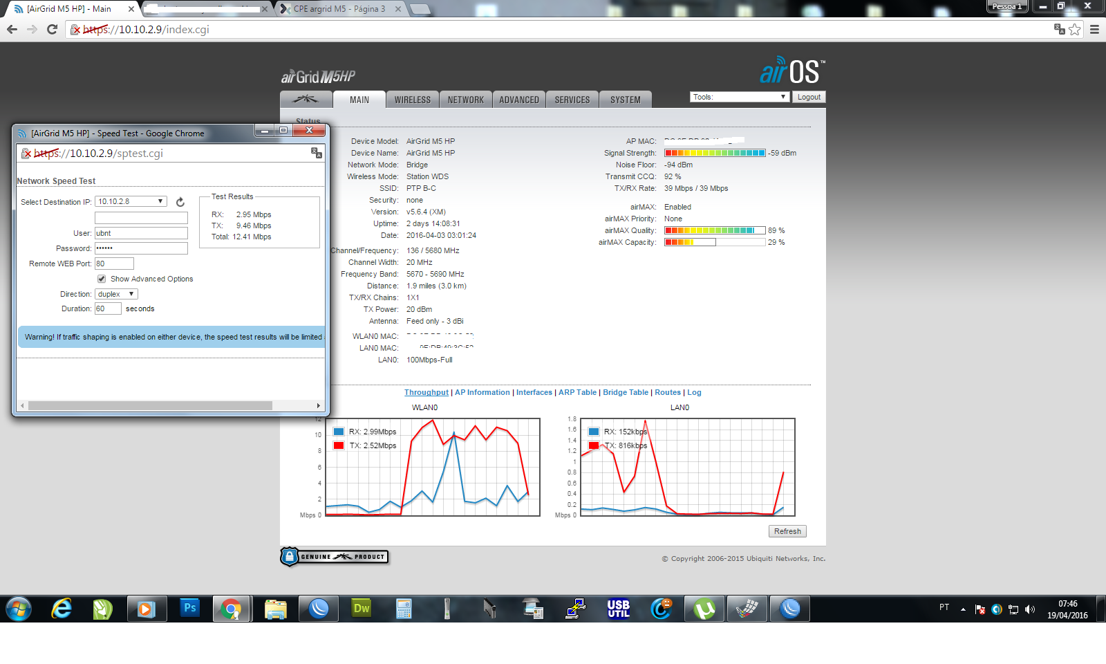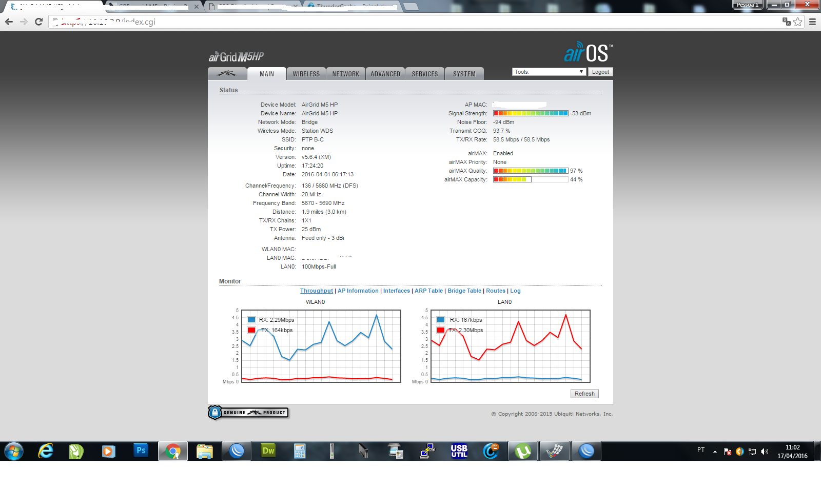 Ou trocar de canal (Abaixo de 5725MHz precisa DFS, acima não precisa) até ter um Airmax Capacity acima de 50%, com ele abaixo de 50% nem vale a pena testar throughput.