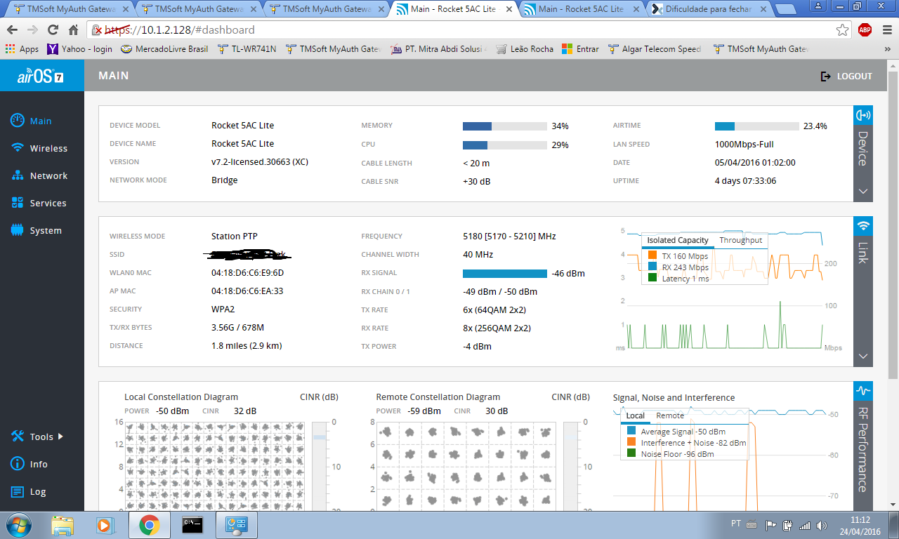estou usando um rocket AC com antena dich AC 30 dbi, precisando passar 100 megas, porém não da mais que 10