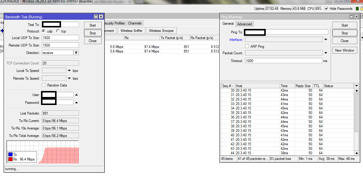 Já realizei troca de canais, largura de frequência, potência e fixei data rates, porém continua do mesmo jeito. Creio que seja casos de próprio hardware do equipamento porque já vi cases de sucesso com PowerBeam M52-300, mas resolvi comprar 2 RouterBoard SextantG-5HPND para substituir esse enlace.