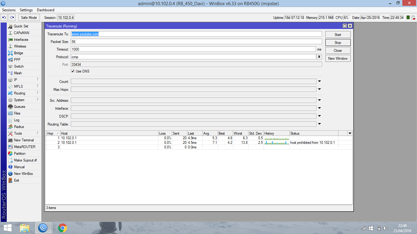 ao acessar o youtube notei que o site não respondeu dai resolvi fazer um traceroute na RB onde estou conectado que não é de borda dai veio a surpresa, na imagem abaixo diz que a minha RB de borda esta proibindo o acesso ao youtube para a RB secundaria....