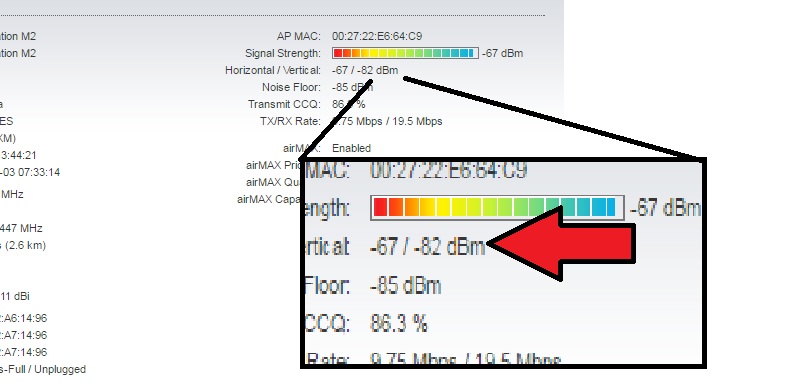 As 2 polarizações tem que ter sinal similar, 3 dBm de diferença no máximo. E ambas precisam ter sinal tipo -65dbm ou mais alto (-64, -63, -62, etc).