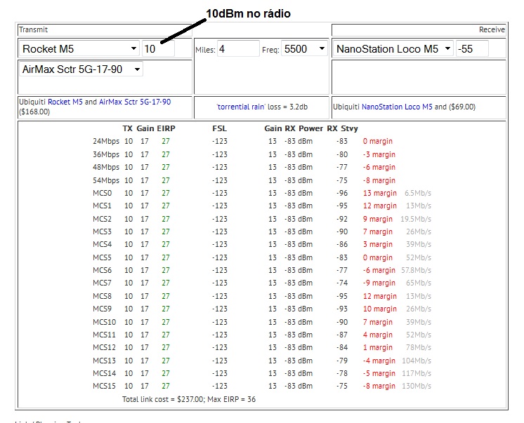 Com a configuração dada, são 36dBm EIRP saindo no Loco M5, SE a visada fosse 100% limpa o sinal devia ficar na casa dos -65dBm no Airgrid.