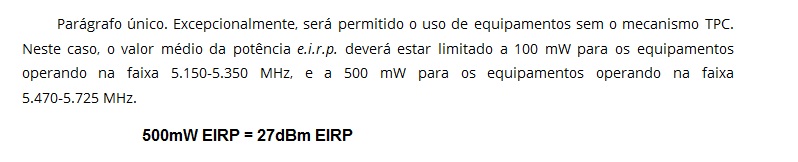 Se você informa pro Rocket que o ganho da antena é de 17dBi, e seleciona o país brasil, não importa qual potêcia colocar o rádio vai limitar a 27dBm EIRPse usar 5400 a 5725MHz.