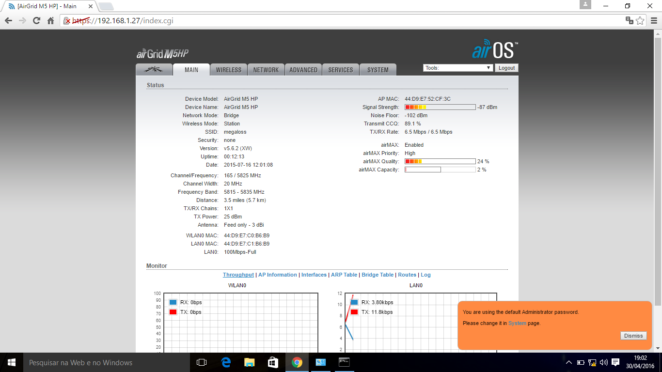 Boa noite, estou aqui novamente , depois de martelar muito com este problema busco aqui alguma luz, estou fazendo um ponto a ponto, no ponto A tenho uma basestation 17 dbi 90º com rocket m5, estou tentando enviar um link para o ponto B, o ponto B esta a 5,5 km em linha reta e com visada, porem o lado B é um prédio de 22 metros enquanto o A é 33 metros, minha basestation eu ja inclinei 3 graus de inclinação abaixo , no B estou usando uma airgrid , segue abaixo o resultado do sinal obtido.