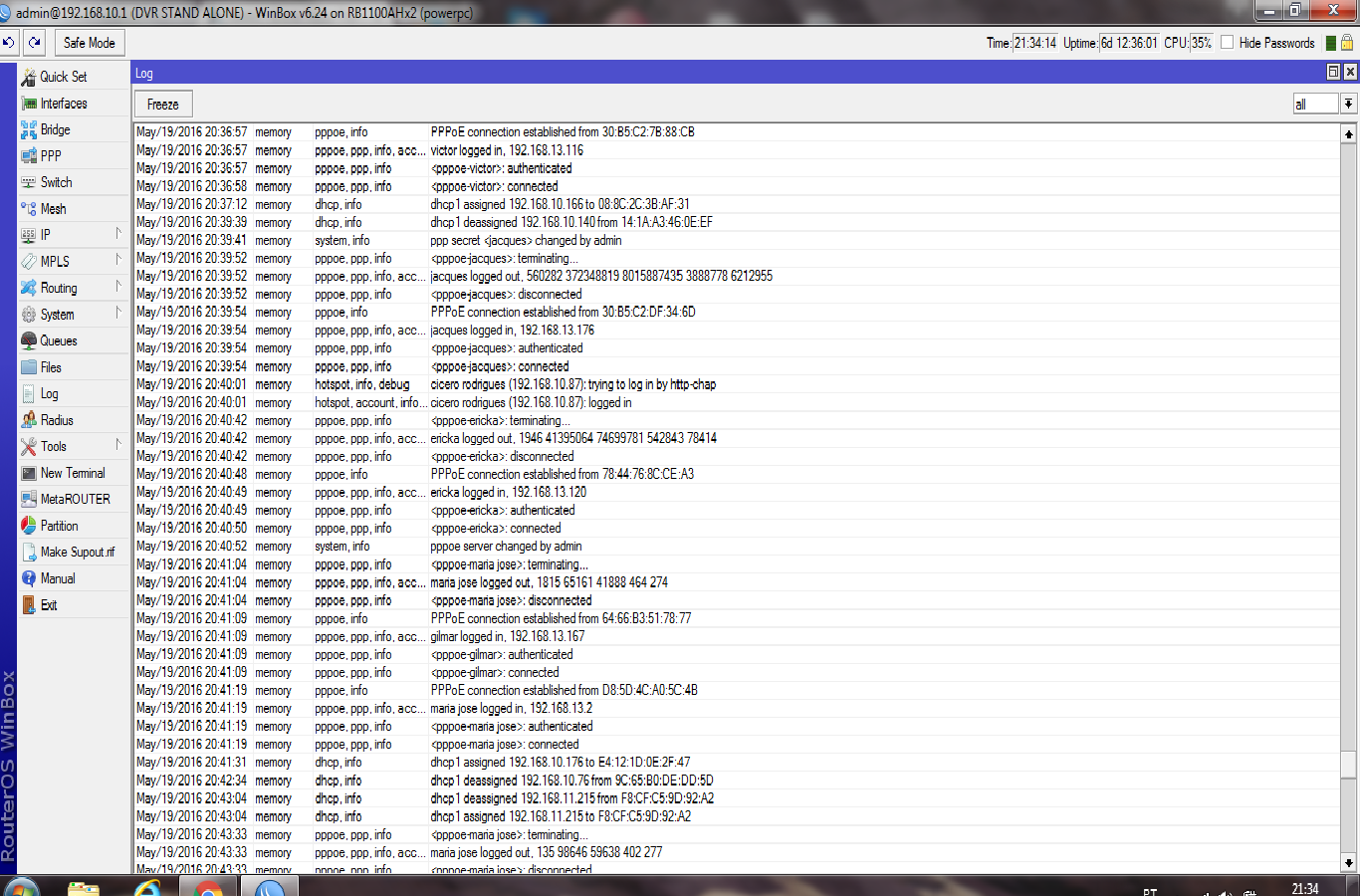 Estou eu a monitorar minha rede, do nada, percebo que o trafego diminui, vou ver o que é, metade dos clientes PPPOE desconectados. Eles desconectam e logo após reconectam. Alguns ficam distantes uns dos outros, alguns da rede cabeada outros da rede wireless. Exemplo: Sergio utiliza no cabo e caiu neste momento, Claudio vizinho dele continua logado(e provavelmente utilizando normalmente). Estou sem entender isto, alguns deslogam e relogam, outros continuam navegando "normalmente", alguns são no WIRELESS, outros na rede cabeada.