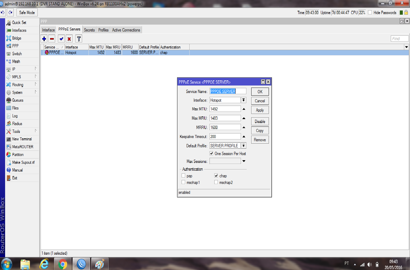 1 - no meu ppoe server esta desabilitado o MRRU e esta sem o keepalive timeout, está também setado como default profile e tbm marcada todas as opções de autenticações (pap, chap, etc).