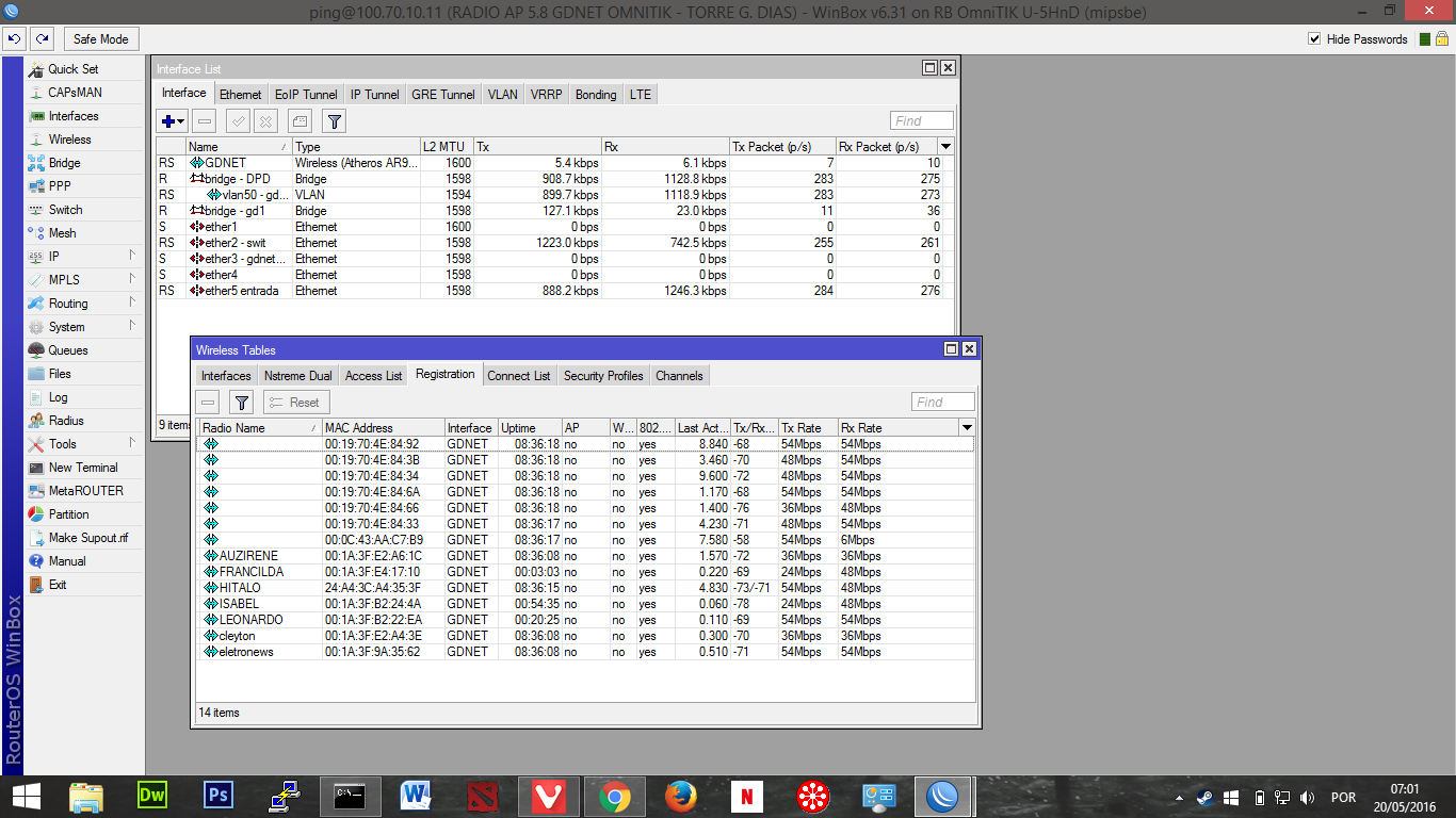 Nota que tem muitos clientes com sinal muito ruim pro data rate em uso! Cliente chegando (RX na torre) com -64dBm de sinal é sinal ruim pro data rate de 54M.