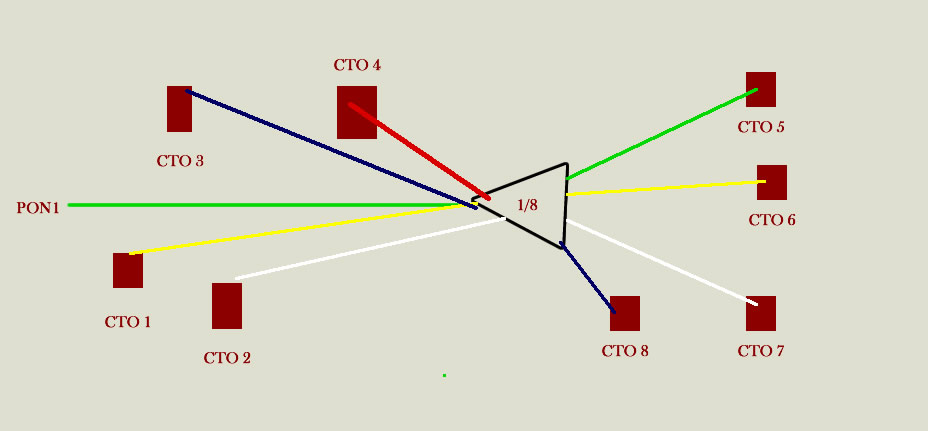 Idéia inicial é começar apenas com uma saída PON e um cabo 12fo (usaremos incialmente 8 fibras) e como primeira etapa, 8 caixas de atendimento 1:16.