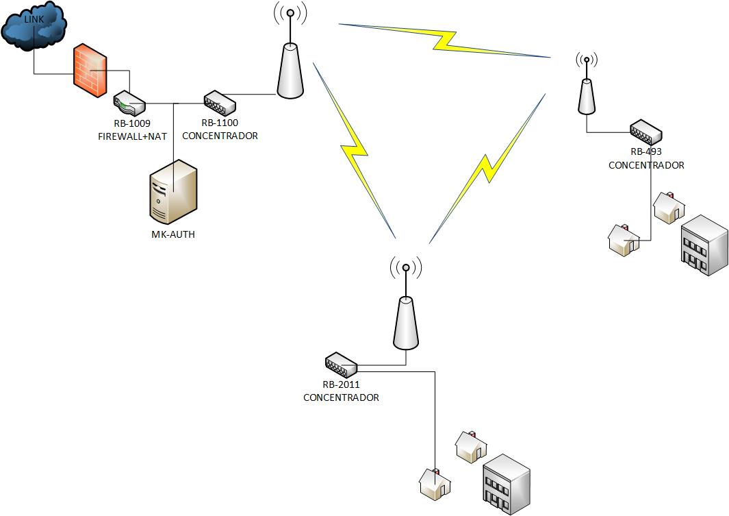 Rede roteada(OSPF), sendo que em cada POP tem seu próprio concentrador.