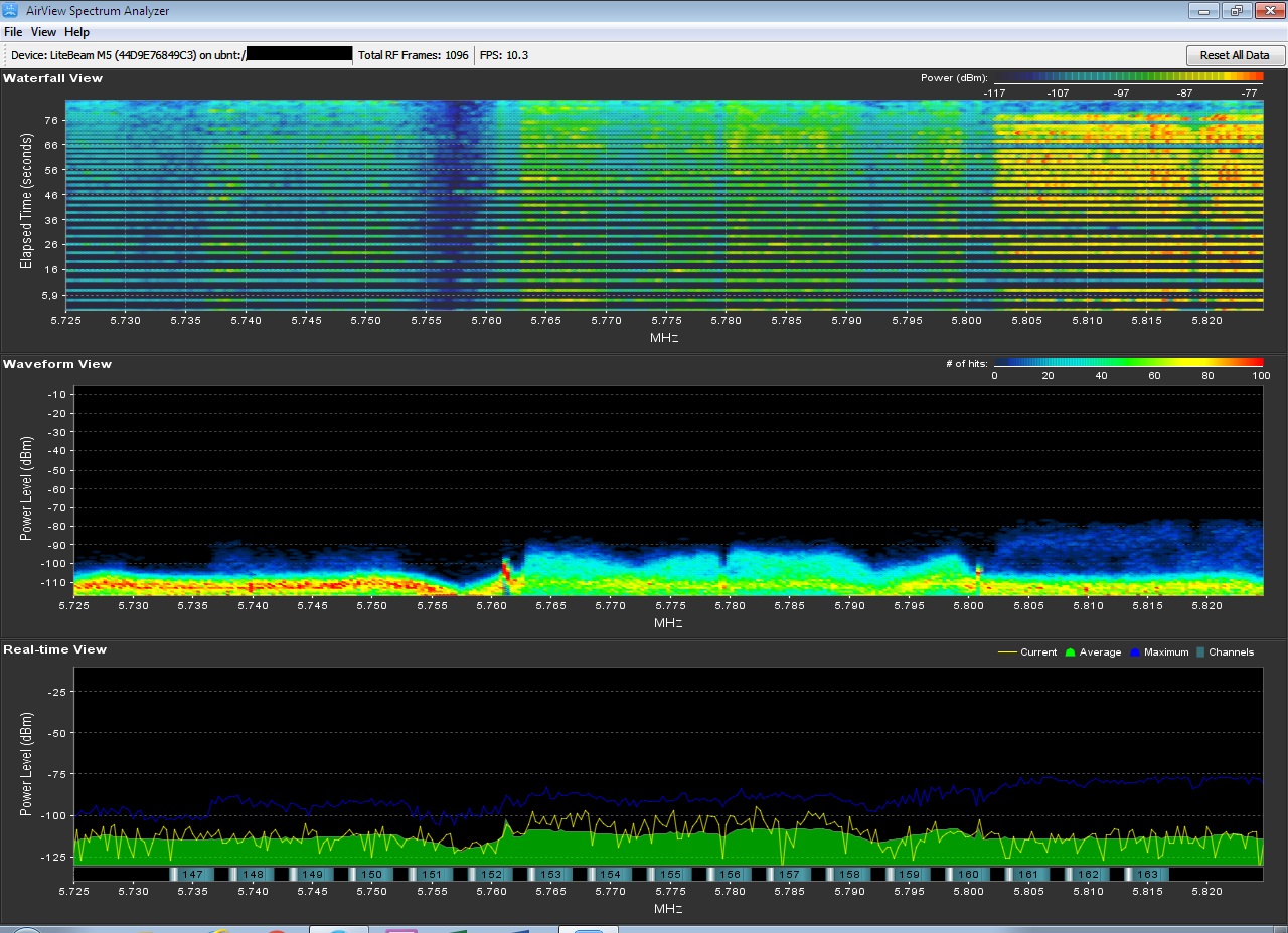 Abaixo de 5760MHz tem poucos hits (Azul indica poucos hits por segundo), e num nível bem baixo (-90dBm). Qualquer coisa abaixo disso vai ficar ok. Quanto a 25Mbps half, usando 20MHz com 2 Litebeam seria bem simples passar isso. Mas... Airgrid tem polarização simples, terá que usar MCS7, que exige sinal muito alto tipo algo acima de -55dBm (Acima: -54, -53, -52, etc).