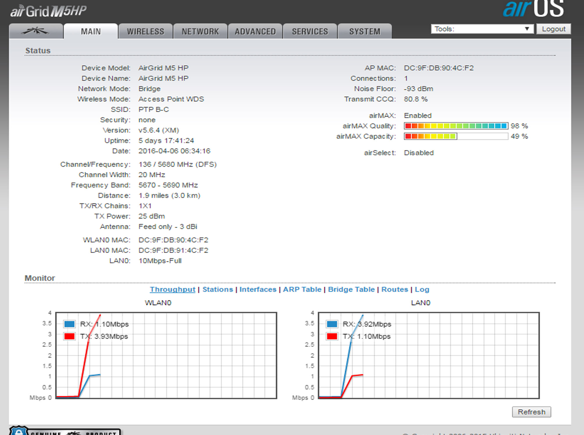 em frequency list mhz deixe apenas o canal que vc esta usando e nao esse tanto marcado, atualize a versao para 5.66, sua LAN0 está dando apenas 10mega, pode ser que o air grid esteja com pau.