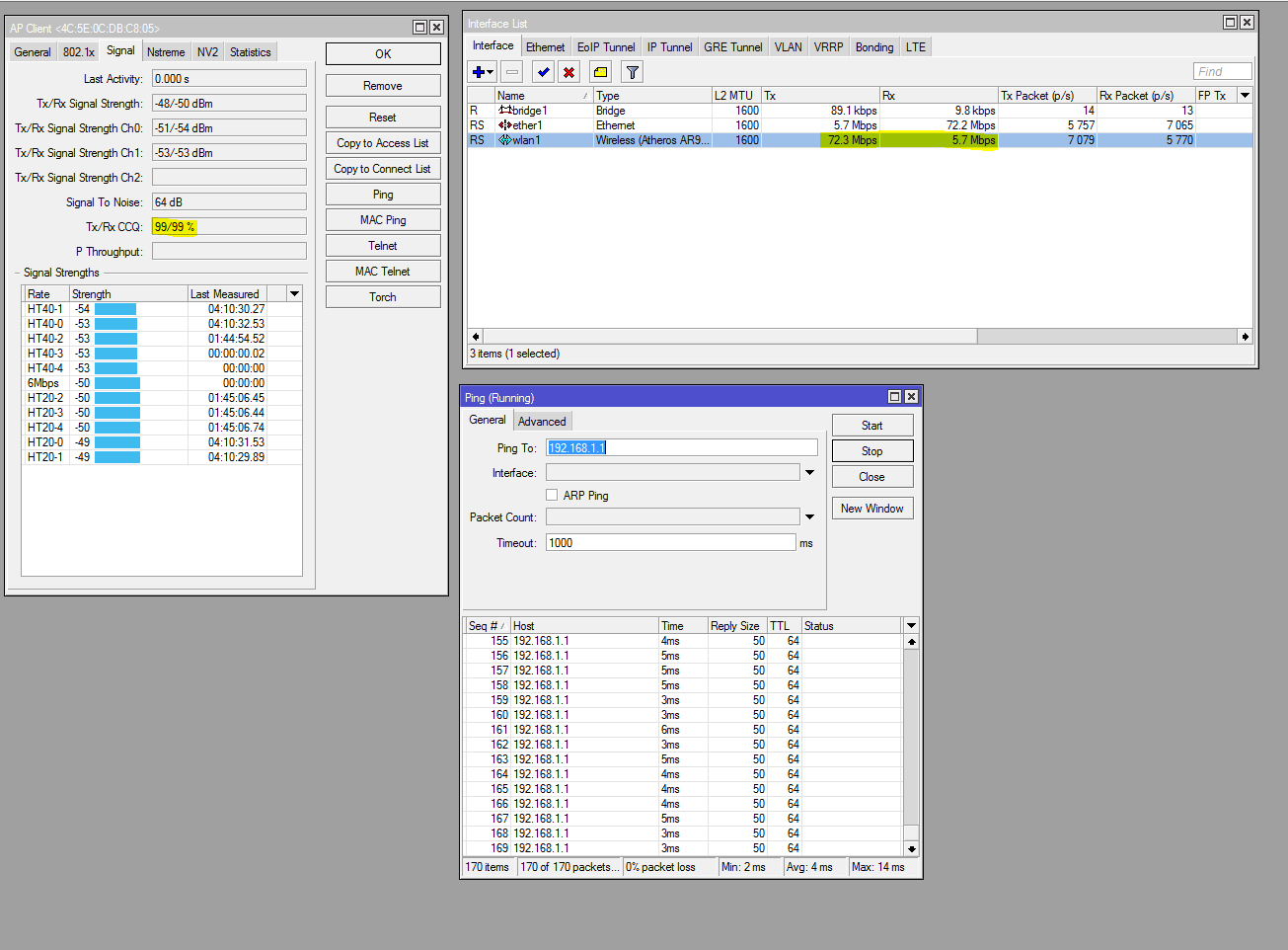 A aba Signa, Noise and Interference mostra o "Interference + noise" chegando em picos de -65dBm, esses picos são algum cliente/estação usando o canal esporadicamente, ainda que não ache outro canal completamente limpo em algum deve ter um uso esporádico que atrapalhe menos, tipo ter uma média de ruído em -75dBm mas ter picos de no máximo -70dBm, isso é muito melhor que picos de -65dBm como tem hoje.