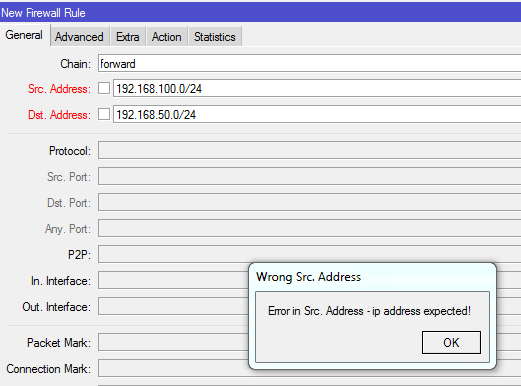 /ip firewall filter add chain=forward src-address=192.168.100.0/24 dst-address=192.168.50.0/24 action=drop
