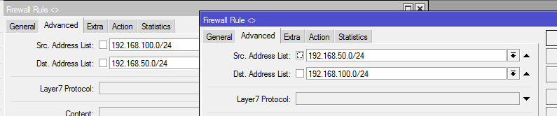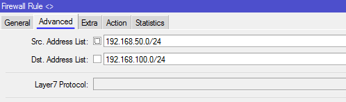 Depois você adiciona na guia Filter, os mesmo itens que estava adicionando, porém, na guia "General", você deixa tanto o "Src. Address" quanto o "Dst. Address" em branco, e na guia "Advanced", no "Src. Address List" você coloca "rede50", e no "Dst. Address List" você coloca "rede100", e na guia "Action", o "Action" é "drop". Depois você tem que adicionar outra regra parecida, porém, inverter o "Src. Address List" e o "Dst. Address List". No terminal, seria assim para adicionar essas 2 regras: