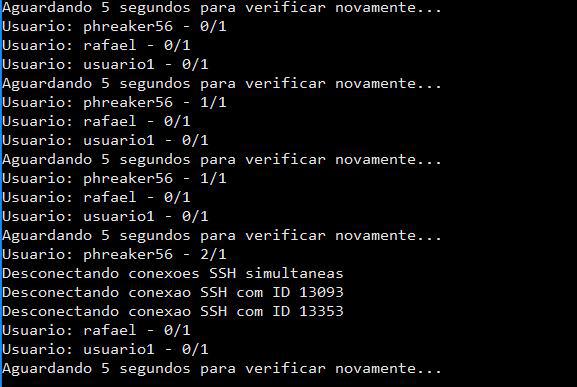 Anexo 64734Olá gostaria de saber se alguém sabe de algum script que possa Impedir conexões SSH simultâneas de uma mesma conta em VPS. Na imagem ao conectar de dois lugares com a conta "phreaker56", ambas as conexões são desconectadas.