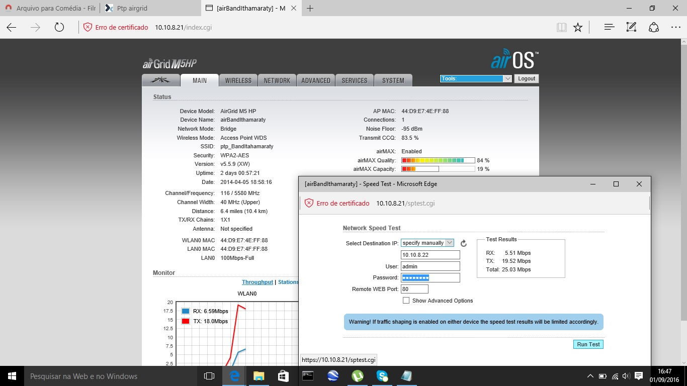 to com ptp com airgrid , 6.6 km distancia - 60 de sinal ccq estável a 90% mcs 6